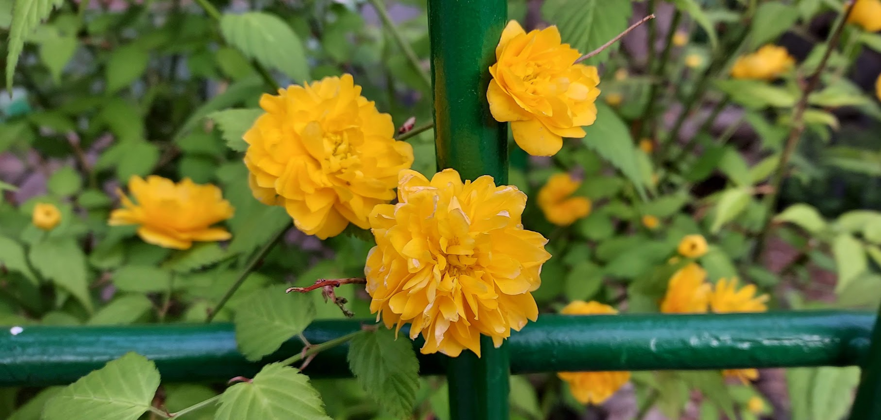 죽단화[겹황매화] 황매화(黃梅花)의 변종으로 정원수로 이용된다. 높이 2m 정도 자라는 관목으로 줄기는 녹색이며 줄기 중심부에는 하얀 솜층의 수(髓)가 굵게 있다. 줄기는 지면의 한 뿌리에서 여러 대가 나와 군생한다. 잎은 녹색으로 좁은 난상 타원형이고 끝은 뾰족하며 호생한다. 잎 크기는 길이가 4~7㎝, 폭은 2~3.5㎝ 정도로 잎 가에는 불규칙한 톱니가 있다. 새싹은 봄에 나오고 4월 말부터 5월에 걸쳐 황금색의 작은 꽃들이 겹으로 엽액에서 단생한다. 꽃의 크기는 2~4㎝로 열매는 없다. 원산지는 일본으로 1속 1종이 나며 한국에는 2변종이 난다. <한국화재식물도감, 하순혜, 탕카> 황매화는 홑꽃이고 죽단화는 겹꽃이다.