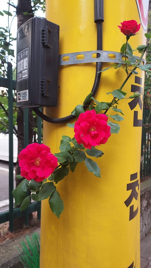장미가 전봇대를 감싼 것인지